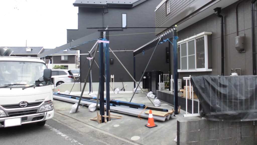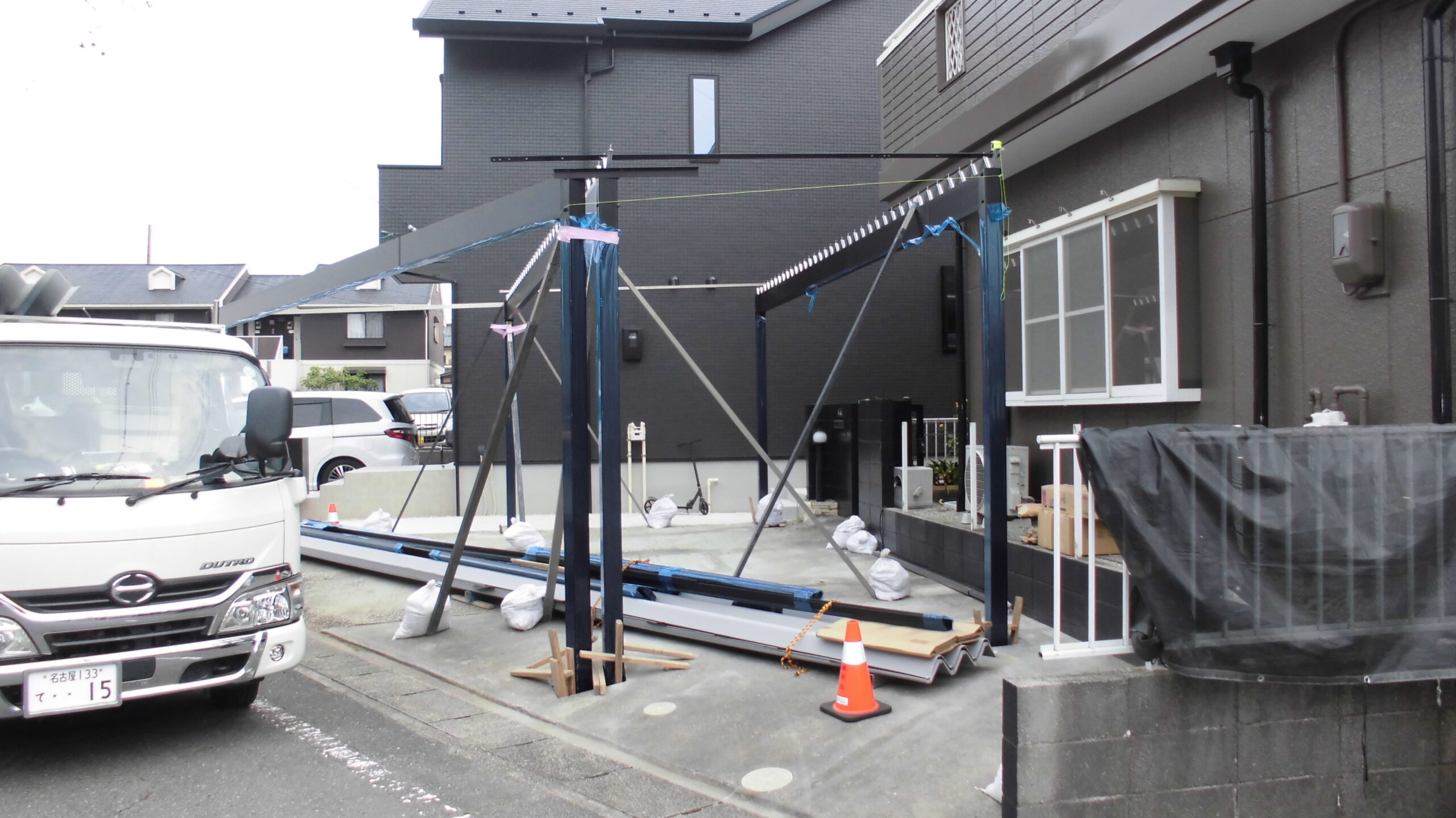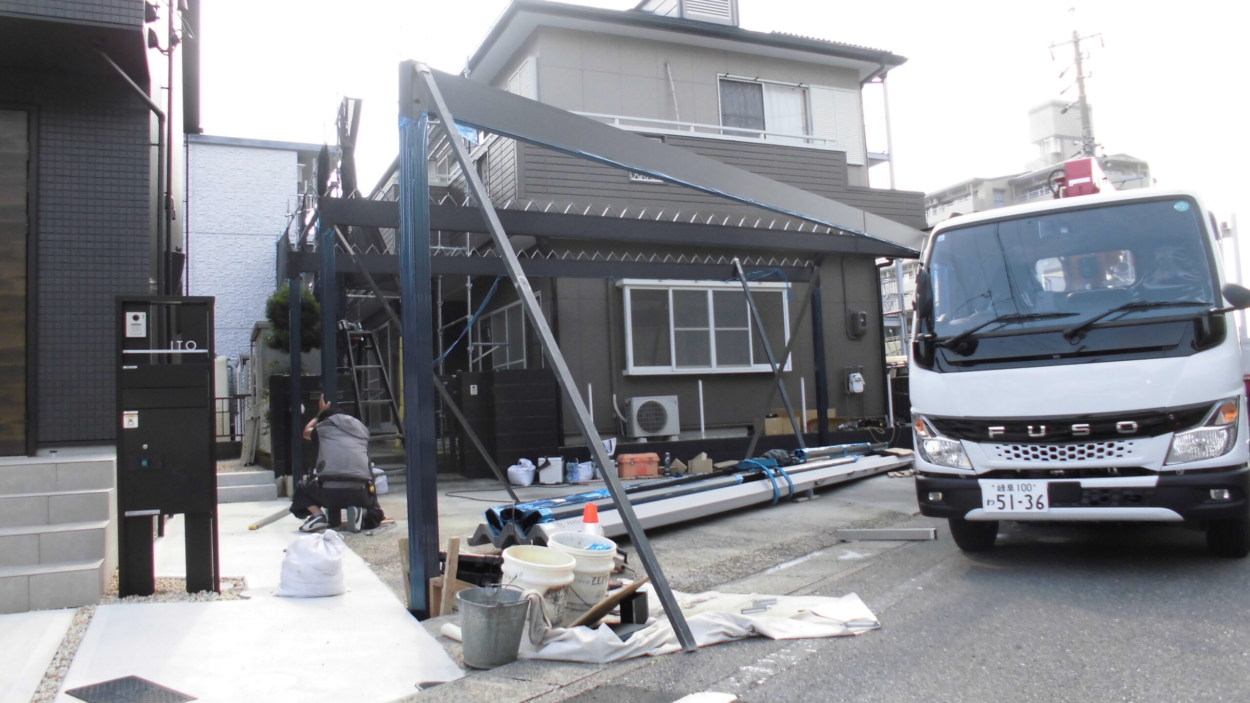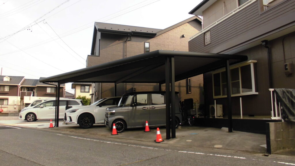 既存の土間はそのままで柱部分を斫りカーポート柱を設置、敷地にあわせた屋根材の加工をしつつ施工しました。