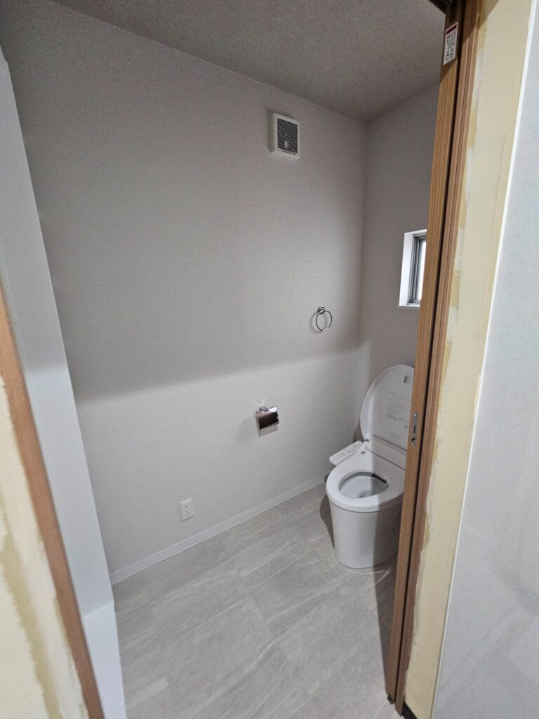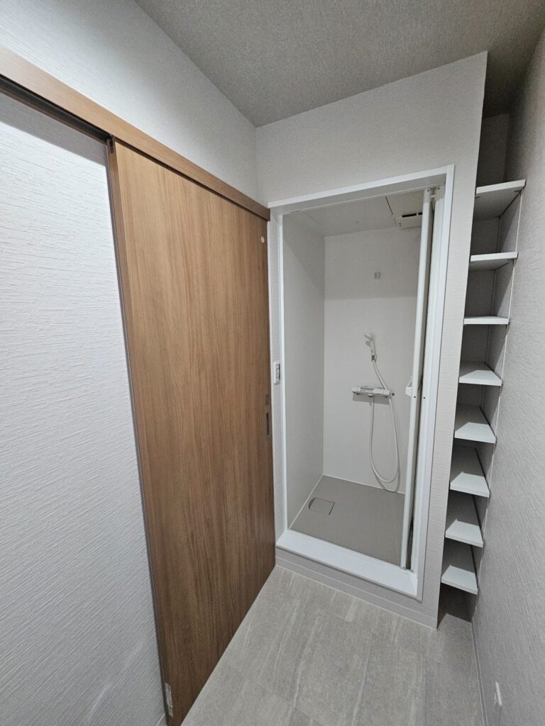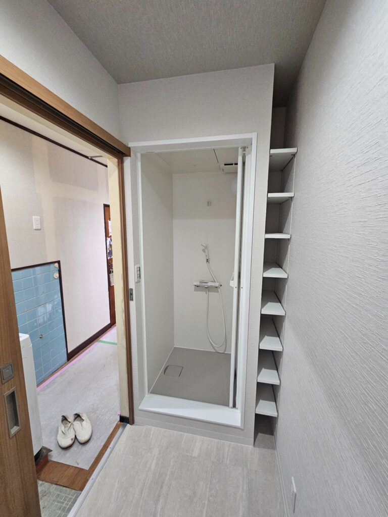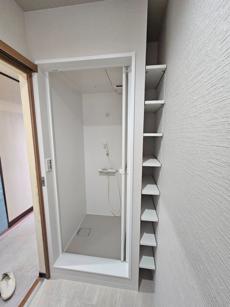 シャワーユニットもトイレ内に設け、天井壁は量産クロス+床はCF(クッションフロア)+ソフト巾木にて仕上げました!