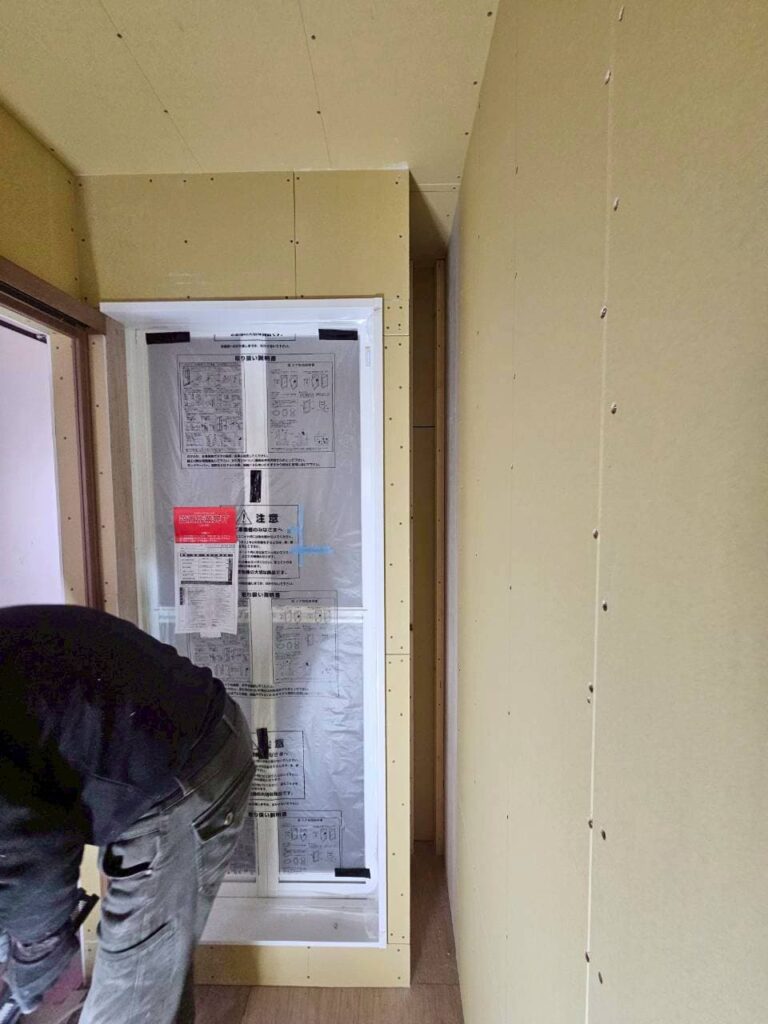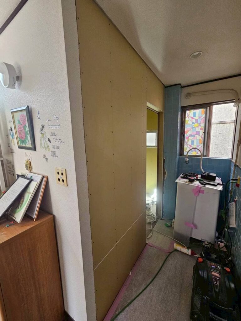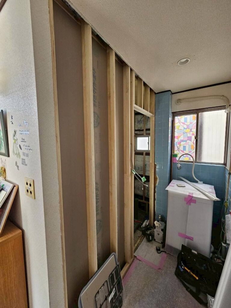 既存トイレ+間仕切り壁と在来お風呂を取り壊し、一つの空間にしました。